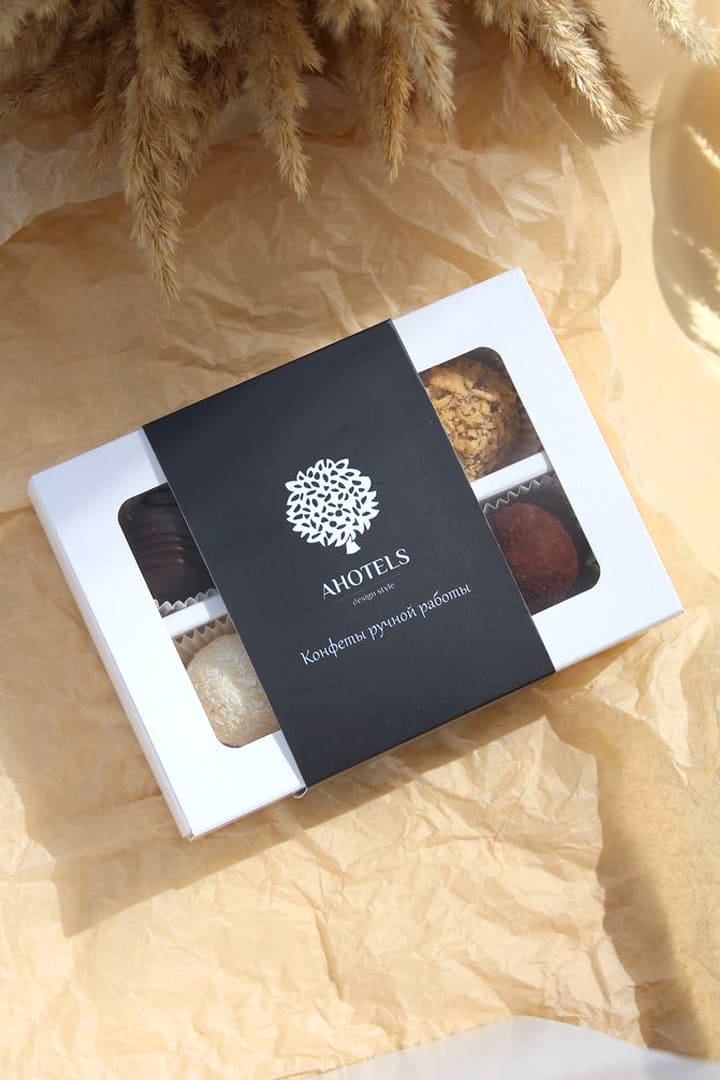 В коробку пенал, закрывающуюся крышкой с окном, вложены 6 шт. вкуснейших, натуральных конфет ручной работы. Коробка обёрнута в шубер с вашим логотипом.