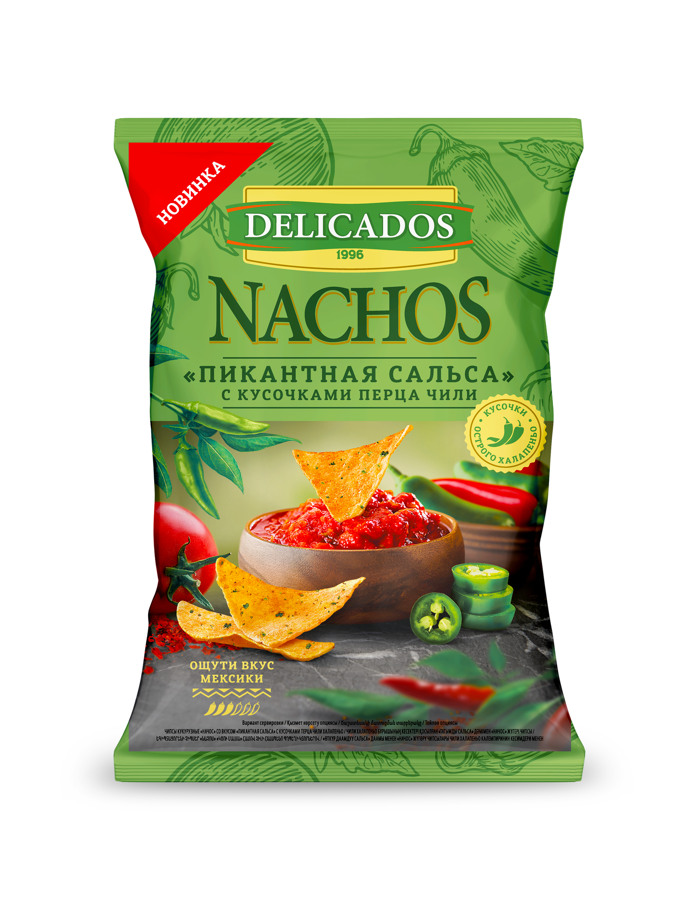 Начос Delicados Пикантная сальса с кусочками перца чили кукурузные отличаются хрустящей текстурой и насыщенным пикантным вкусом. Продукт быстро насыщает и заряжает энергией, тонизирует и восстанавливает силы.Кусочки перца чили халапеньо придают чипсам пикантные обжигающе-острые нотки