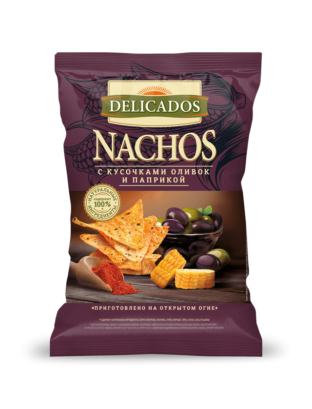 Начос Delicados с кусочками оливок и паприкой кукурузные отличаются хрустящей текстурой и насыщенным пикантным вкусом. Продукт быстро насыщает и заряжает энергией, тонизирует и восстанавливает силы. Это классические начос в сочетании с пряно-сладкой паприкой и испанскими оливками. Чипсы изготовлены исключительно из цельного зерна кукурузы.
