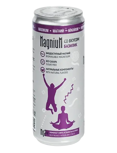 Напиток функциональный безалкогольный газированный "МagniuМ" со вкусом "Базилик" - это безалкогольный газированный напиток, обогащенный цитратом магния, предназначенный для поддержки жизненно важных функций организма. Его основное назначение - обеспечить организм магнием, который участвует в выработке коллагена, улучшении усвоения витамина D и кальция, а также может способствовать успокоению и омоложению. Состав: вода питьевая подготовленная, магния цитрат, фруктоза, регулятор кислотности лимонная кислота, натуральный ароматизатор «Базилик», подсластитель стевиолгликозиды (стевия), консерванты: бензоат натрия, сорбат калия. В одной банке 0,33 л содержится 60-66 мг магния. Пищевая ценность на 100 мл (средние значения): углеводы 0,8 г. Энергетическая ценность 3 ккал/13 кДж.