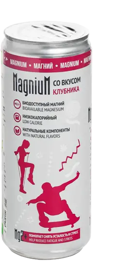 Напиток функциональный безалкогольный газированный "MagniuM"со вкусом "Клубника" - это безалкогольный газированный напиток со вкусом клубники, обогащенный магнием. Он предназначен для восполнения дефицита магния в организме, который поддерживает работу нервной системы, снижает усталость и стресс, а также помогает в усвоении кальция и витамина . Магний в основе напитка поддерживает жизненно важные функции организма. Состав: вода питьевая подготовленная, магния цитрат, сахарный сироп, регулятор кислотности лимонная кислота, ароматизатор натуральный «Клубника», ароматизатор натуральный, натуральный краситель кармин, консерванты: безонат натрия, сорбат калия. Пищевая ценность: углеводы: 5 г. Энергетическая ценность: 20 ккал; 85 кДж. Магний: 18-20 мг. В одной банке содержится 60-66 мг. магния, 15% от рекомендованной суточной нормы для взрослых. Потребляемая норма напитка не более 4 банок в сутки.