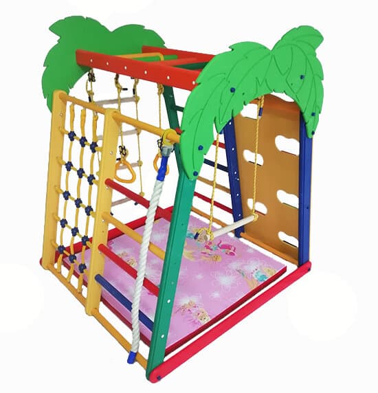 Напольный спортивный комплекс со скалодромом - это многофункциональная домашняя или уличная конструкция для детей (иногда взрослых), предназначенная для комплексного физического развития, укрепления мышц, развития координации и ловкости, а также для активных игр всей семьей. Скалодромная часть тренирует руки, ноги и плечевой пояс, а весь комплекс дает возможность выполнять разнообразные упражнения, заменяя целый спортивный зал в миниатюре, и подходит для использования на дачах или в квартирах, где есть место. Детские напольные дск устанавливается на пол. Спортивный комплекс представляет собой сборно-разборную конструкцию из массива дерева и металла. Длина, ширина, высота комплекса - 1,18*1,29*1,45 м В базовой комплектации: рукоход, шведская стенка наклонная, скалодром, сетка для лазания, трапеция, кольца гимнастические, канат х/б, лестница веревочная.