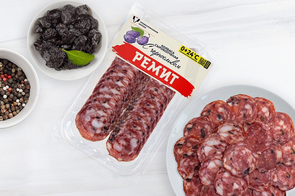 Состав: свинина, слива сушеная (чернослив), посолочно-нитритная смесь (соль, фиксатор окраски: нитрит натрия), пищевые волокна (цитрусовые, свекольные), мальтодекстрин, декстроза, соль пищевая, усилитель вкуса и аромата глутамат натрия 1-замещенный, ароматизаторы (салями, чернослив), экстракт пряности: перец черный, гемоглобин (свиной), антиокислитель изоаскорбат натрия, сахар, краситель кармины, масло растительное, стартовые культуры. Производится на предприятии, где также используются горчица, молоко, орехи, пшеница, сельдерей, соя и яйца. Пищевая ценность в 100 г продукта (средние значения): белки - 22 г, жиры - 31 г, углеводы - 5 г. Энергетическая ценность (калорийность): 390 ккал/1620 кДж. Срок годности: 90 сут.