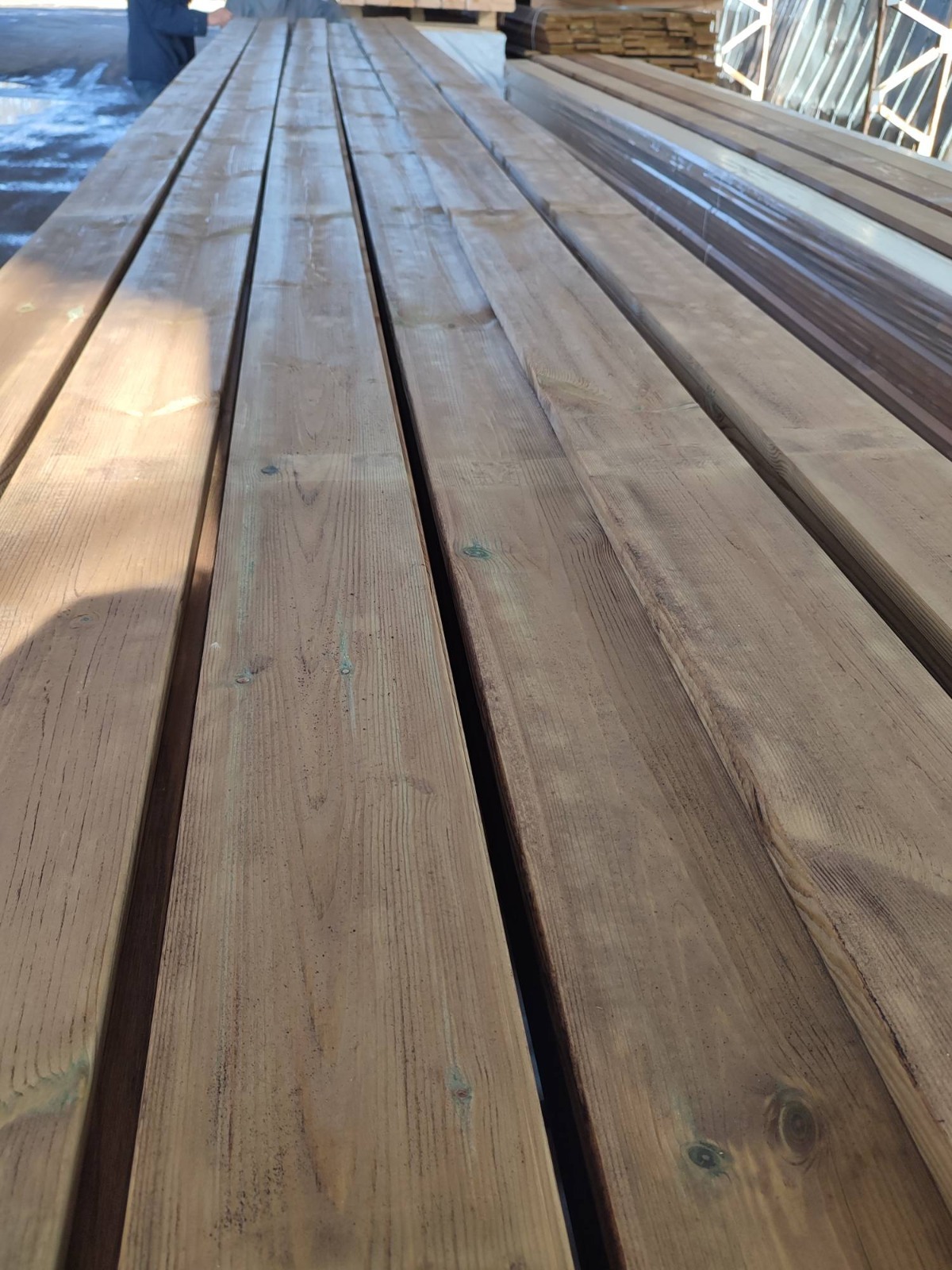 Экономия на покраске и обработке антисептиком. Цвет пропитки коричневый. Масло и колеровка не нужны! Импрегнирование древесины – технологический процесс вакуумной пропитки доски антисептиком. Импрегнирование древесины проводится под давлением до 12 атмосфер, что обеспечивает глубокое проникновение антисептика в поры заболонной части доски. Соответствует степени пропитки Hazard Class 4 по европейской шкале стандартов. Традиционно обработке подвергается доска из сосны, имеющая гораздо большую заболонную часть, чем елка. Импрегнированная доска имеет срок службы до 25 лет на открытом воздухе и до 15 лет при укладке на землю. Для импрегнирования наших изделий мы применяем английский антисептик Tanalith E зеленого и коричневого оттенков. Импрегнированная планка применяется для финишной отделки террас и входных групп; беседок, пергол и других садовых декоративных форм. Бюджетный вариант террасного настила для малонагруженных террас, садовых дорожек, межгрядочных терминалов, зон отдыха вокруг бассейнов, элементов пергол, сходен, причалов и многого другого.