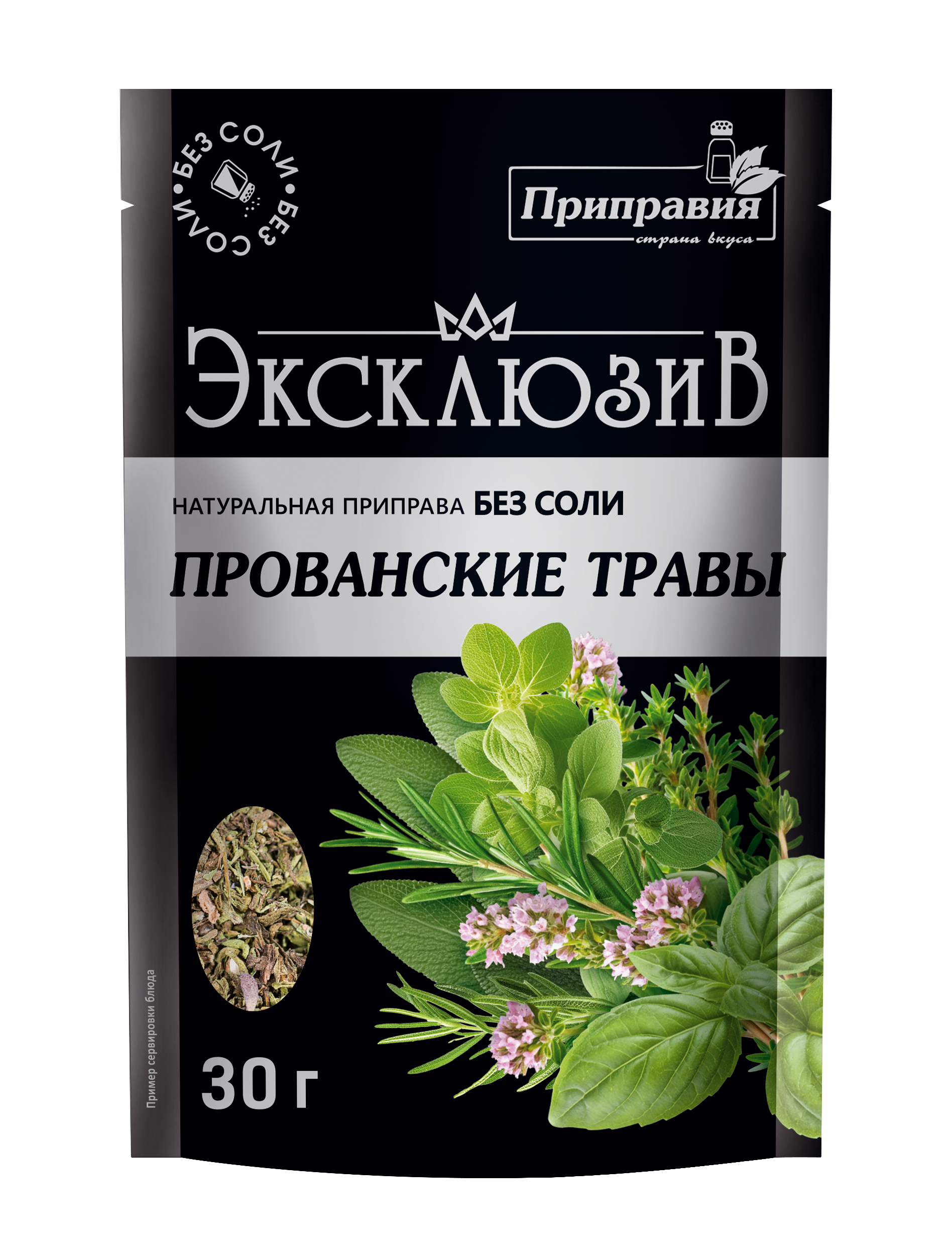 Состав: Базилик сушеный, розмарин дробленый сушеный, тимьян сушеный, чеснок измельченный сушеный, майоран сушеный, мята сушеная, паприка красная сушеная, чабер сушеный, шалфей дробленый сушеный, орегано сушеный.