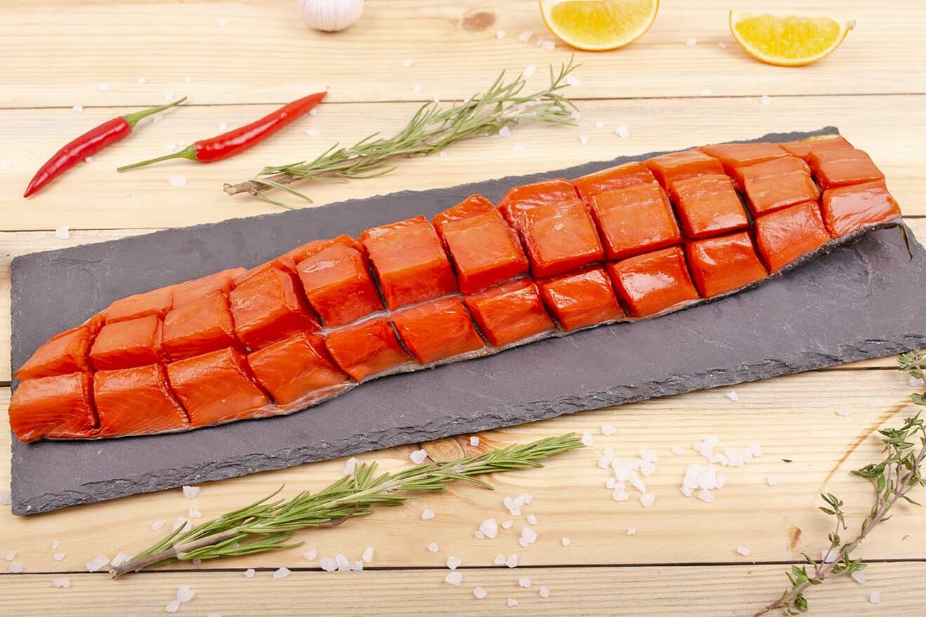Оригинально и вкусно. Из рыбы вытаскиваются кости, филе нарезается ровными квадратами, затем рыба коптится. Без добавок, только рыба и соль.