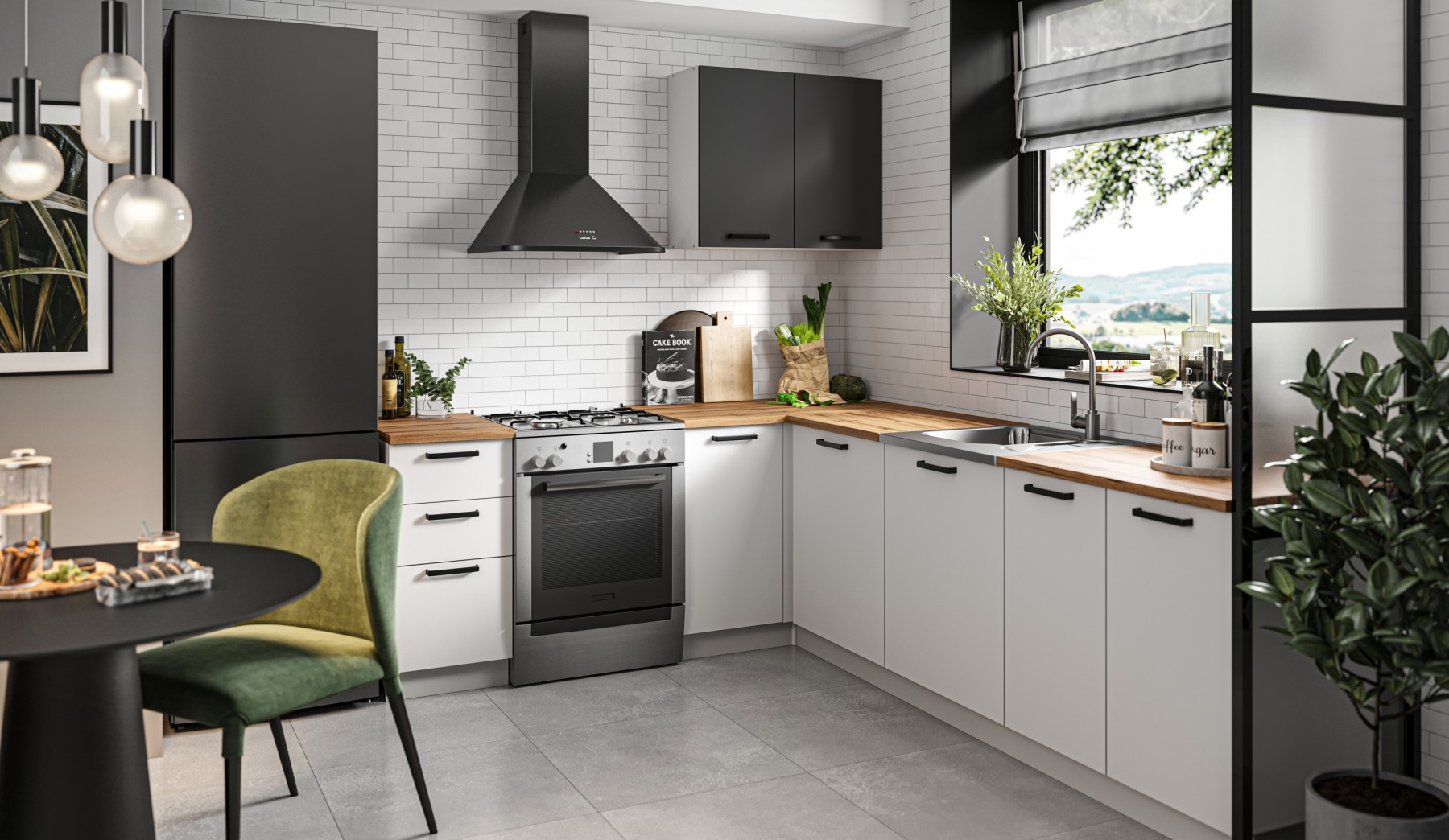 Кухонный гарнитур Ника Нео сочетает в себе элегантность и функциональность, подходит для помещений разного размера, позволяя использовать всё полезное пространство. Верхние шкафы выполнены в насыщенном антрацитовом цвете, который сочетается с белыми нижними модулями, создавая легкий и свежий вид. Четкая игра контрастов делает кухню визуально привлекательной и оригинальной. Ручки черного цвета с мягким покрытием soft-touch выглядят стильно, комфортны в использовании. Столешница, имитирующая текстуру дуба, добавляет тепла и уюта, завершая гармоничный облик кухни.