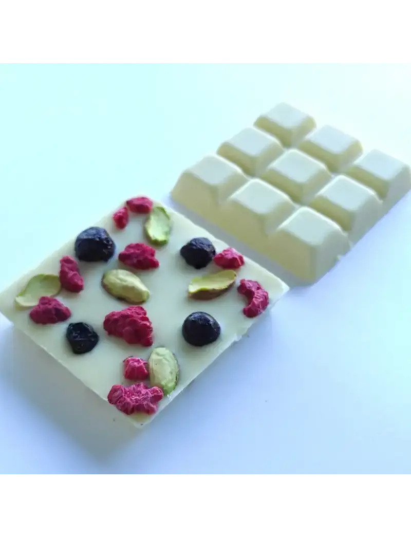 Белый шоколад с Малиной сублимированной, Фисташками и Черной смородиной сублимированной.