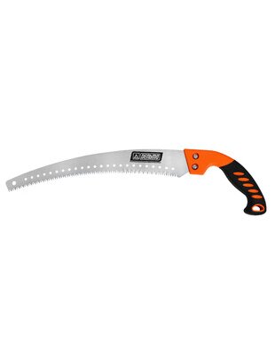 Ножовка с изогнутым полотном и пластиковой ручкой предназначена для обрезки деревьев и кустарников, подходит для формирования кроны. Рабочее лезвие с переменным зубом имеет особо острую заточку для более легкого реза сучков и веток. Ее конструкция с изогнутым полотном обеспечивает удобный хват, эффективное пиление сырой древесины, веток и кустарников, а также позволяет работать в стесненных условиях, не задевая соседние ветви. Зубья крупные, разведенные, что предотвращает застревание в сыром дереве.