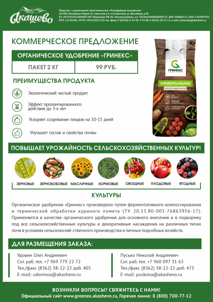 Органическое удобрение "ГРИНЕКС" - быстродействующее комплексное органическое удобрение по своим качествам превосходит известные органические удобрения, а по эффективности - не уступает минеральным. Рекомендуется для выращивания всех сельскохозяйственных культур. Органическое удобрение "ГРИНЕКС" произведено путем ферментативного компостирования и термической обработки куриного помета.