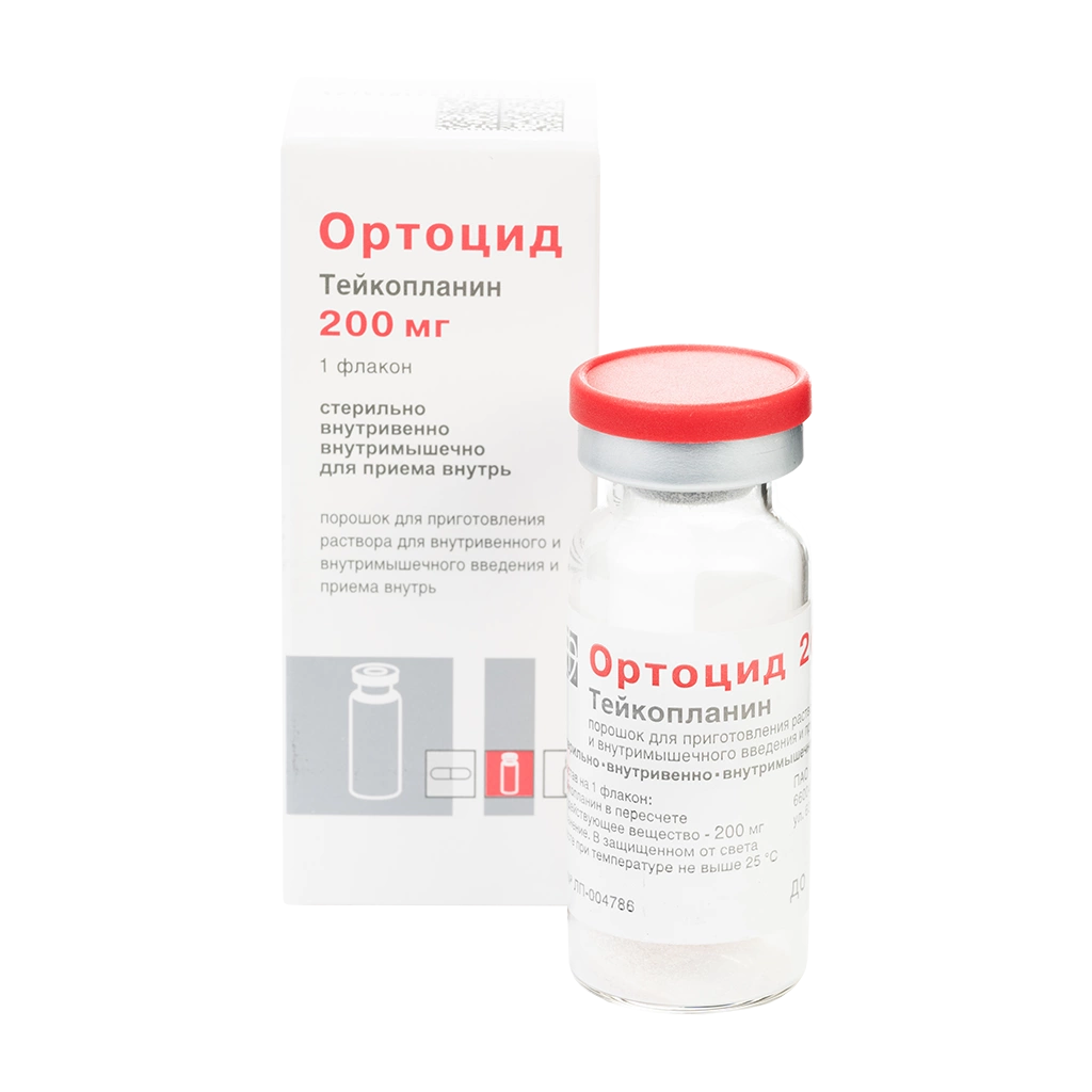 Ортоцид - это бактерицидный антибиотик группы гликопептидов, содержащий активное вещество тейкопланин. Применяется для лечения тяжелых грамположительных инфекций (эндокардит, септицемия, инфекции кожи, дыхательных путей). Поставляется в виде порошка для приготовления растворов для инъекций (внутривенных/внутримышечных) и приема внутрь.