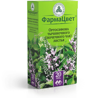 Ортосифона тычиночного (почечного чая) листья - это лекарственное растительное сырье с мочегонным, спазмолитическим и желчегонным действием. Используются при отеках из-за болезней почек/сердца, воспалениях мочевыводящих путей, подагре и гипертонии. Вид упаковки - картонная пачка с 20 пакетиками для удобного заваривания.