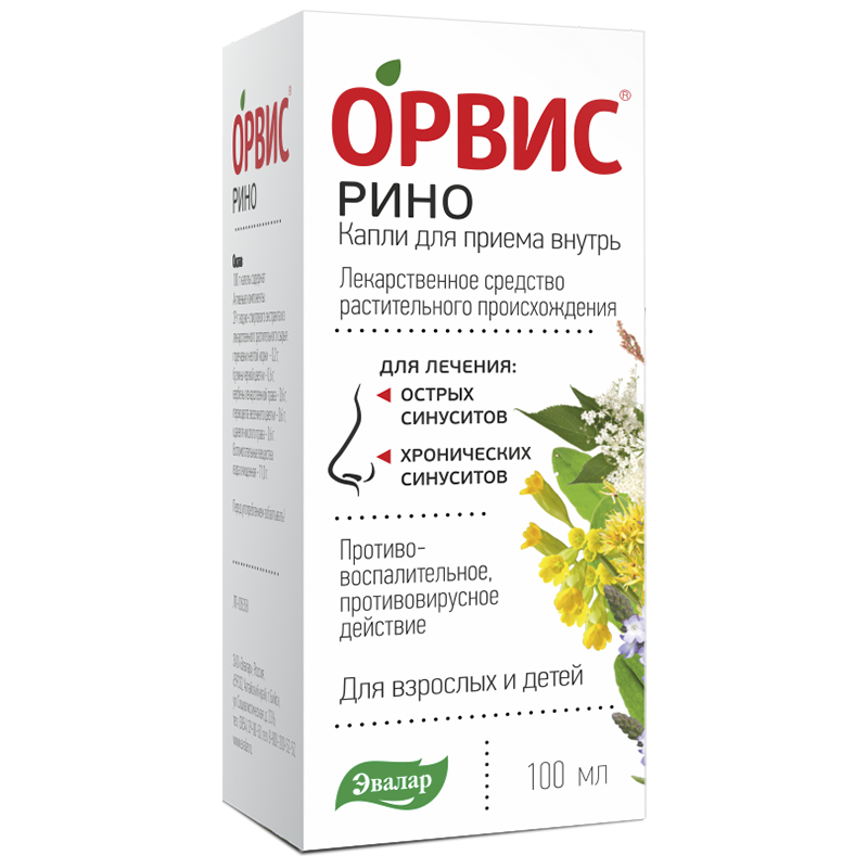 Орвис Рино - это растительное лекарственное средство (не БАД), применяемое для лечения острых и хронических синуситов (гайморита, фронтита) и затяжного насморка. Препарат уменьшает отек, разжижает вязкий секрет и облегчает дыхание. Состав включает растительные компоненты: корни горечавки, цветки первоцвета, щавель, бузину, вербену. Поставляется в форме капель для приема внутрь во флаконах по 100 мл.