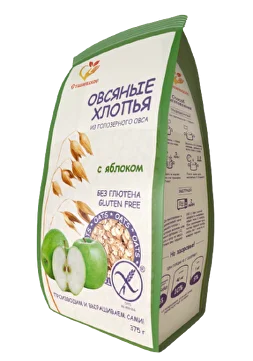 В хлопья добавлены кусочки натурального сублимированного яблока, с которыми блюдо приобретает особенный нежный вкус и дополнительную питательность. Голозёрный овёс, использованный для приготовления этих хлопьев, содержит большое количество масел и аминокислот, чем обусловлены отменные вкусовые качества продукта. По сравнению с плёнчатым сортами он отличается повышенным содержанием сырого белка. Добавлено натуральное сублимированное яблоко.