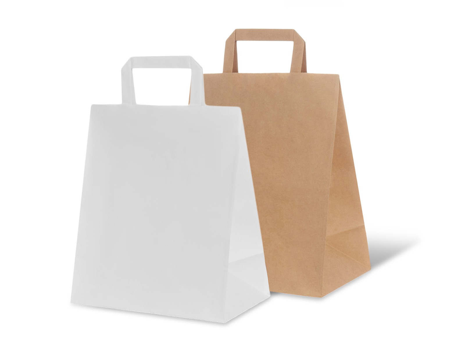 Бумажные пакеты с плоскими ручками – красивый, удобный и надежный упаковочной материал. Их используют под пищевые продукты (особенно распространены в кафе и ресторанах для изделий на вынос) и для товаров народного потребления (одежда, обувь, аксессуары, косметика, бижутерия и пр.). Такие фирменные пакеты изготавливаются из отбеленной или крафт-бумаги натурального цвета.