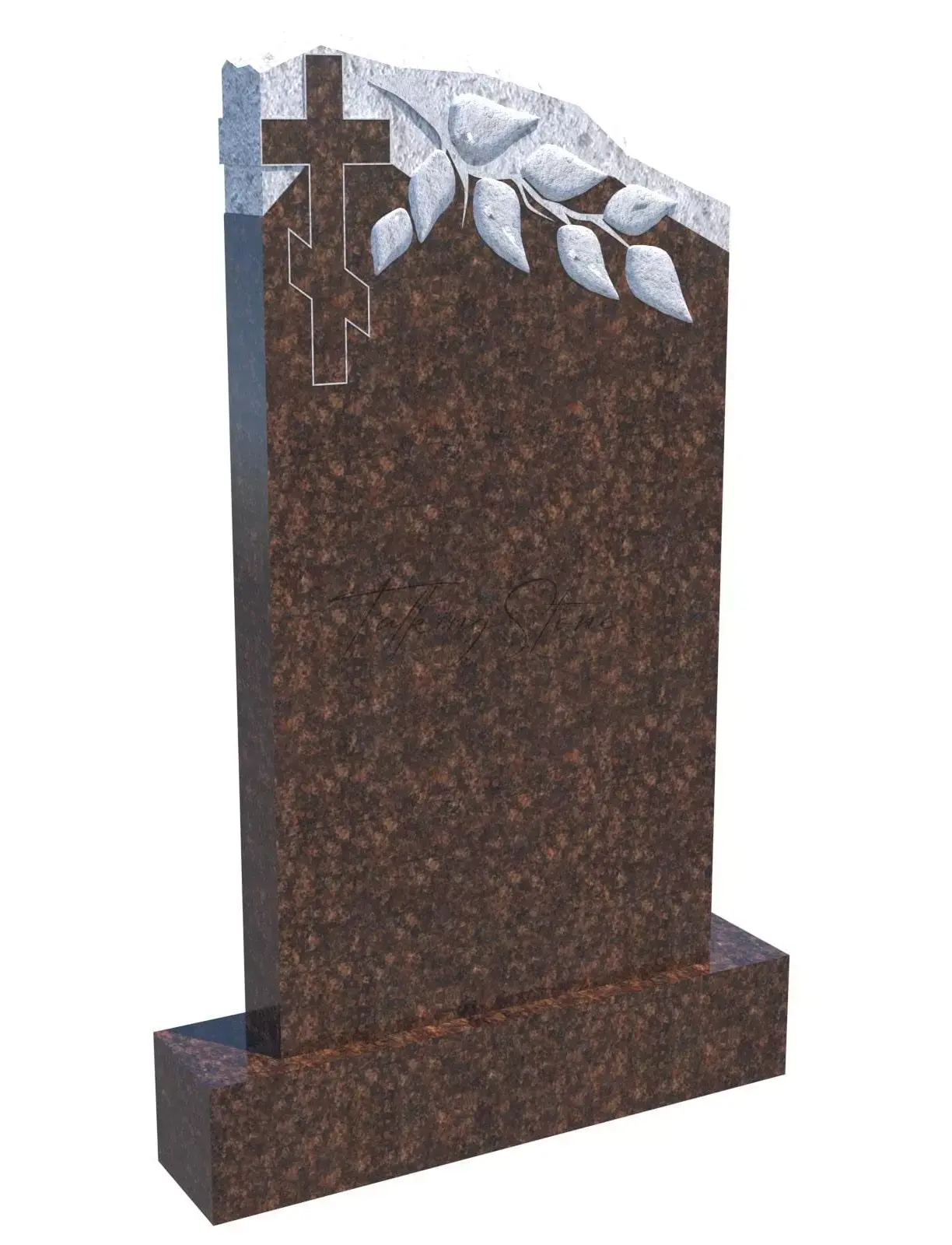 Памятник с крестом в верхней части и ветвью GC0013 представляет собой изысканное сочетание художественной резьбы и природной фактуры камня. Монумент выделяется на фоне классических надгробий благодаря уникальному дизайну: в верхней части расположен православный крест, от которого ниспадает декоративная ветвь с листьями, а естественная красота необработанного среза подчеркнута контрастной светлой полосой. Изготовленный из прочного натурального гранита (Габбро-Диабаз), памятник обладает исключительной долговечностью и устойчивостью к любым погодным условиям. Средний размер изделия и возможность изготовления по индивидуальным параметрам делают его универсальным решением для достойного оформления захоронения.