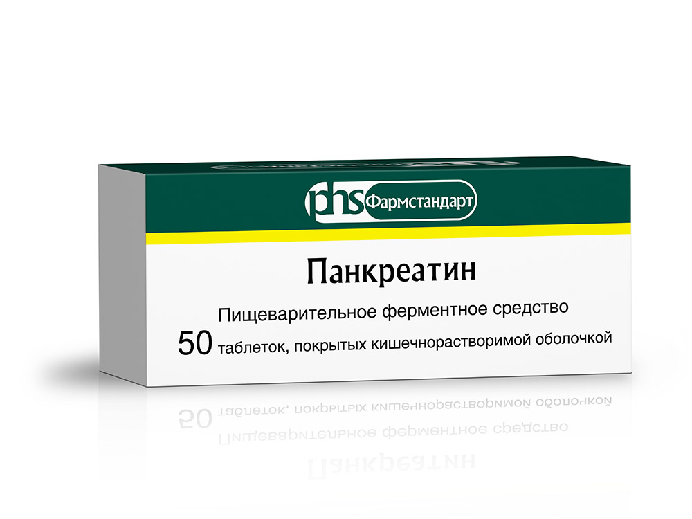 Панкреатин - это ферментный препарат (экстракт поджелудочной железы свиней/крупного рогатого скота), который восполняет нехватку собственных ферментов организма. Препарат компенсирует недостаточность внешнесекреторной функции поджелудочной железы, оказывает протеолитическое, амилолитическое и липолитическое действие. Входящие в состав панкреатина ферменты (липаза, амилаза, трипсин, химотрипсин) способствуют расщеплению белков до аминокислот, жиров до глицерина и жирных кислот, крахмала до декстринов и моносахаридов. Улучшает функциональное состояние желудочно-кишечного тракта, нормализует процессы пищеварения. Трипсин ингибирует стимулированную секрецию поджелудочной железы, оказывая анальгезирующее действие. Панкреатин выпускается в форме таблеток, покрытых кишечнорастворимой оболочкой, 125 мг по 50 таблеток в упаковке.