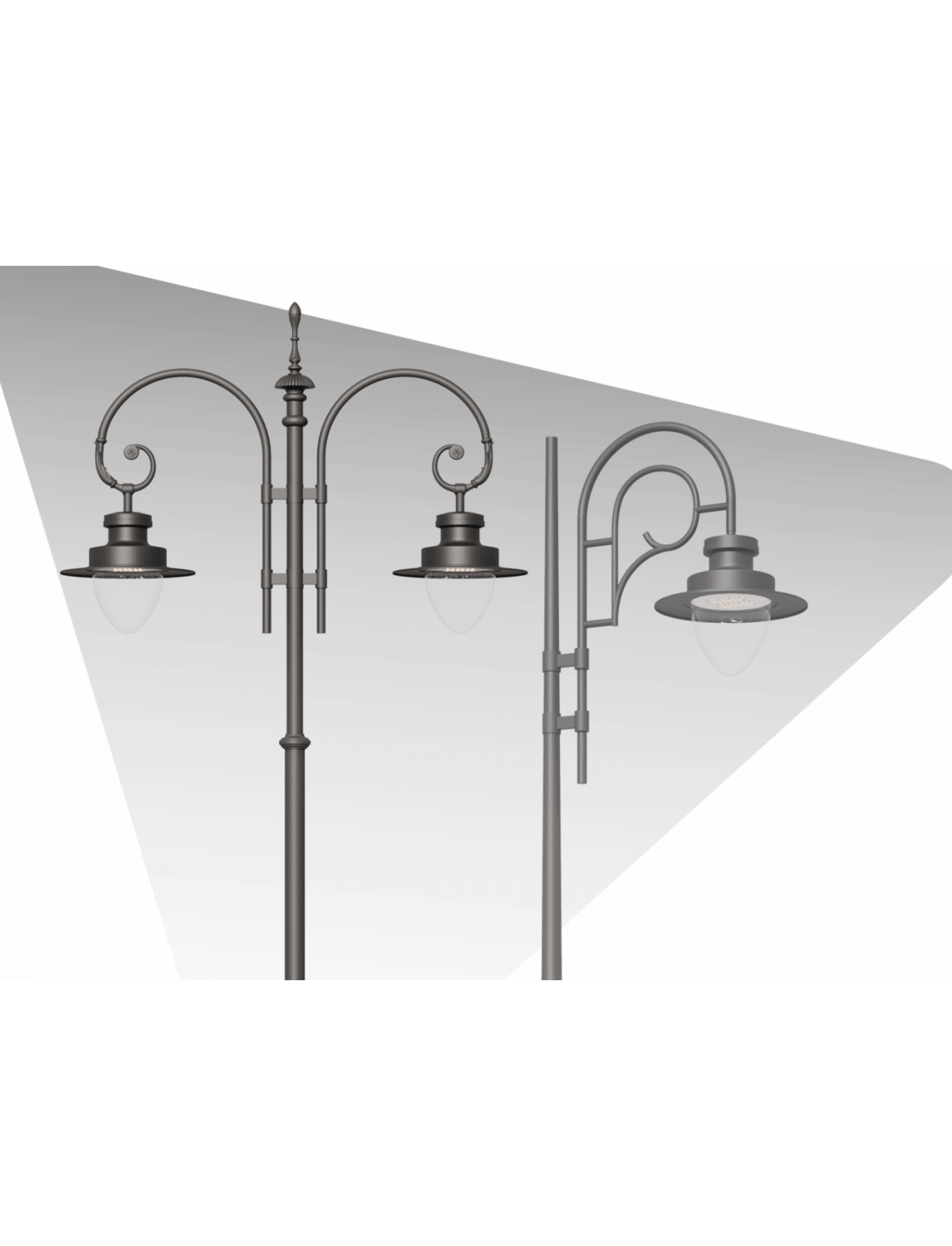 Тип комплекса широко применяется для декоративного и функционального освещения парков, скверов, пешеходных зон и архитектурных объектов, обеспечивая равномерное распределение света. Комплекс отлично подойдет проекты в стиле классицизма или исторического стиля.