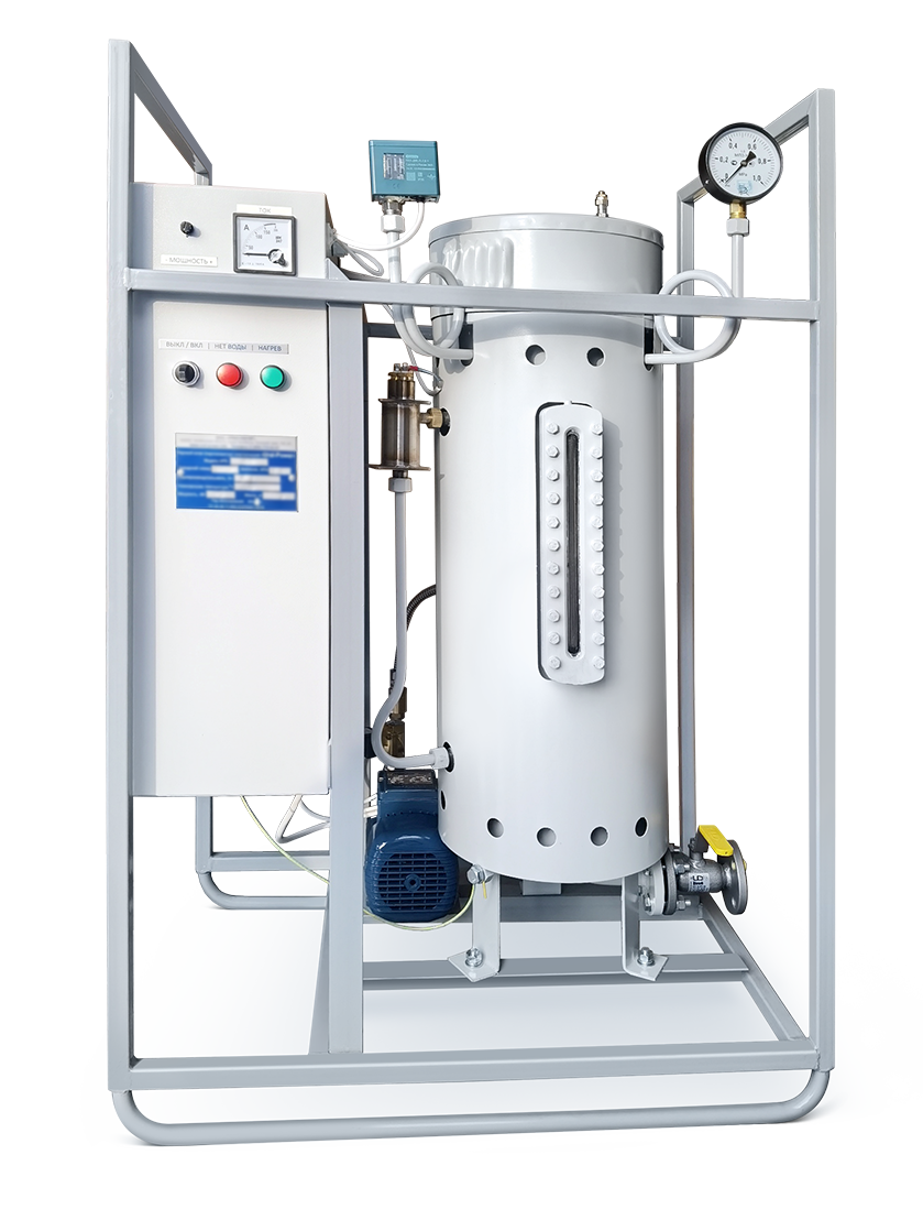 Паровой котел электрический UPE-50 - это промышленная установка мощностью около 35 кВт, предназначенная для выработки насыщенного пара (до 50 кг/час) с температурой до 191°C и давлением до 1,2 МПа. Используется для технологических нужд: стерилизации, пищевого производства, пропарки, очистки и дезинфекции. Номинальный ток - 45-50 А. Регулировка мощности - 25-100%. Срок службы - до 20 лет при соблюдении плановых технических мероприятий. Комплектация данного котл: корпус парового котла на раме, электродная группа, шкаф управления, фильтр питательной воды, реле давления настраиваемые, патрубок подключения пара с ответным фланцем, автоматика поддержания уровня, световая индикация, регулятор мощности (контакторное управление), защита от "сухого хода", запорная арматура, дренажный шаровый кран, электрооборудование, КИПиА, колонка датчиков уровня, предохранительный клапан, манометр, указатель уровня воды, питательный насос.