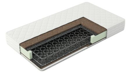 В его основе находиться зависимый пружинный блок типа «Бонель». В состав наполнения входят: хлопковый войлок. кокосовая койра (30мм), холофайбер. Периметр матраса с четырёх сторон проложен слоями ппу. тем самым усиливая его края и предавая ему ровные контуры. Чехол изготовлен из пышного двойного х/б жаккарда стёганного на синтепоне. Высота матраса 23 см, жёсткий.