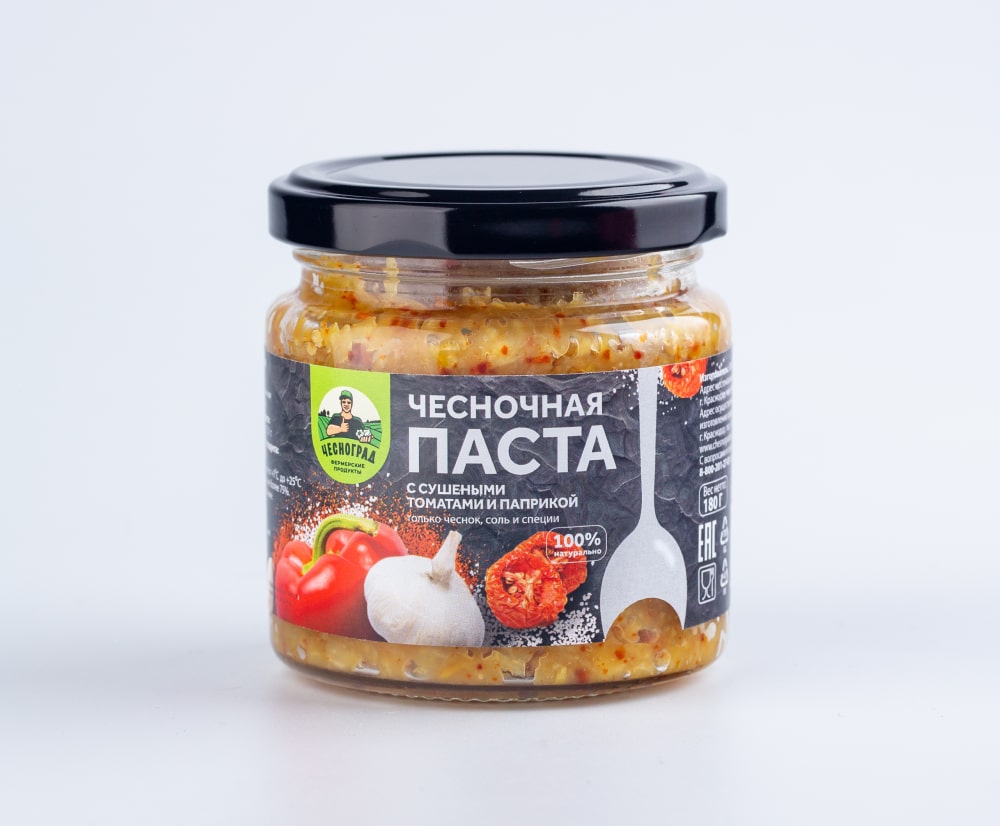 Паста чесночная – монопродукт на полке (эксклюзивный продукт). Продукт, получаемый путем переработки, выращенного на Кубани на собственных полях, экологически чистого чеснока с добавлением соли. Чесночная паста добавит пикантности и свежего оттенка любому блюду. Рецептурный диапазон очень широк, поэтому паста — незаменимый помощник в ресторанной и домашней кухне, так же используется для подготовки продуктов к барбекю, шашлыку и копчению.