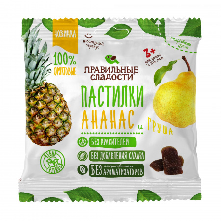 Полезные, натуральные и ароматные фруктовые пастилки из яблочного и грушевого пюре с добавлением ананасового сока. Изготавливаются без добавления сахара, искусственных ароматизаторов, консервантов и красителей. Посыпка цитрусовыми волокнами добавляет в пастилки необходимую для организма клетчатку.