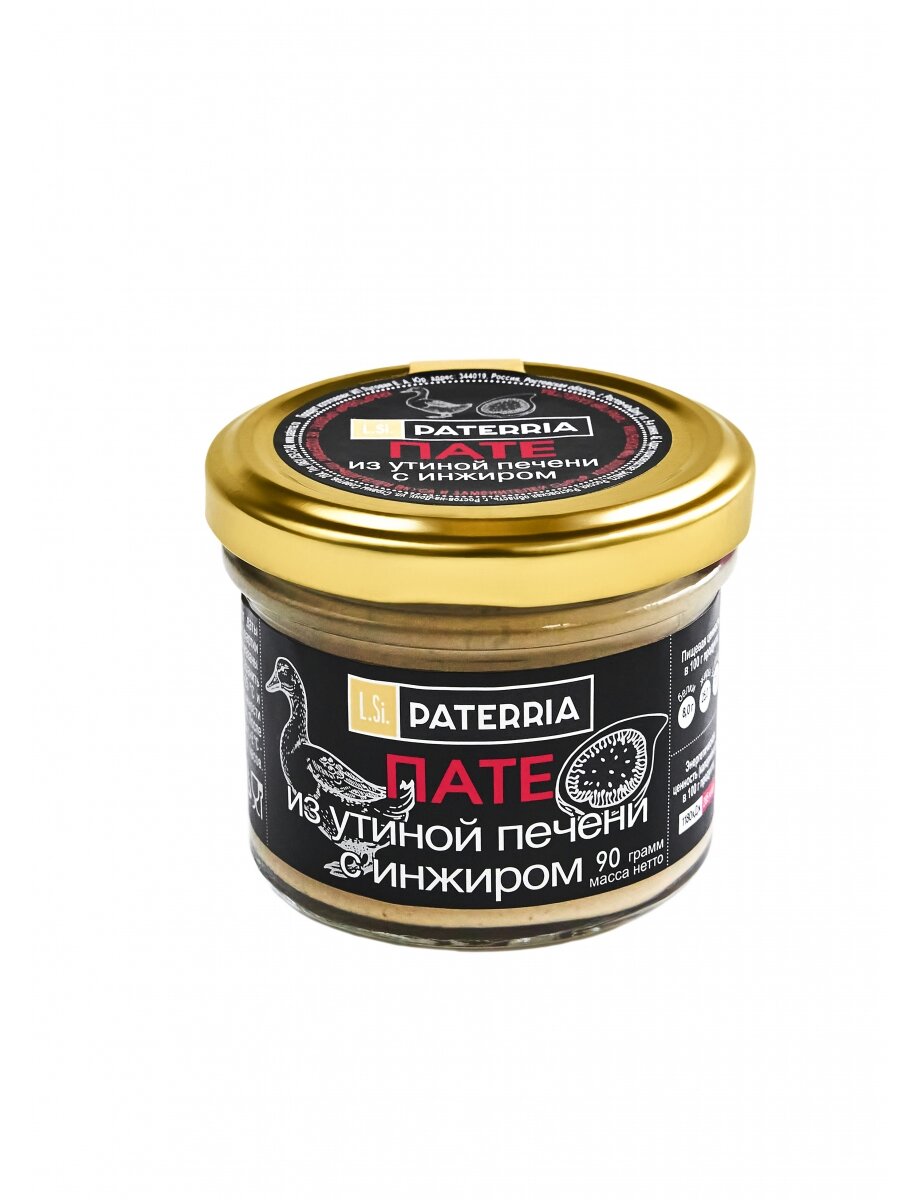 Паштет бронзового цвета, с запеченной коричневой корочкой, консистенции сливочного масла, с крупинками инжира. Этот паштет мы создали для истинных ценителей и гурманов! Уникальный в своей идее и изысканный по составу — утиная печень в сочетании с томленным в белом вине инжиром и авторским набором специй.