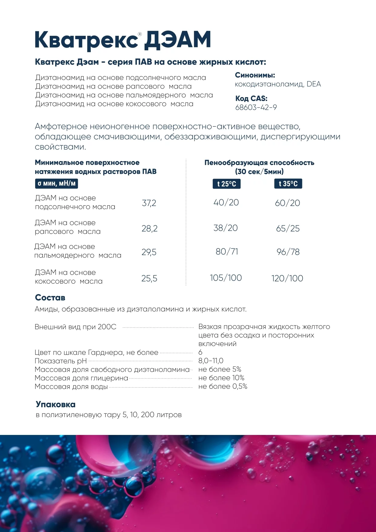 Поверхностно активное вещество Кватрекс ДЭАМ предназначен для использования в производстве товаров бытовой химии и технических моющих средств. Неионогенное поверхностно-активное вещество,загуститель, пенообразователь, стабилизатор пены,солюбилизатор, эмульгатор