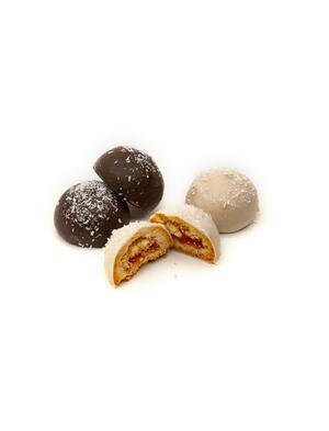 Рассыпчатое песочное печенье с абрикосовой начинкой под белой и тёмной глазурью с обсыпкой из кокосовой стружки.