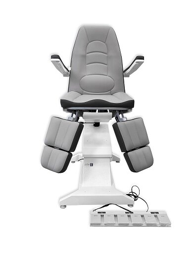Педикюрное кресло “ФутПрофи-3 Pro” с раздвижными подножками - это профессиональное, высокотехнологичное оборудование с тремя электроприводами. Оно предназначено для оснащения педикюрных и подологических кабинетов, обеспечивая максимальный комфорт клиента и эргономику работы мастера. Данная модификация кресла дополнительно укомплектована: возможность раздвижения подножек до 45º относительно центральной оси кресла; опрокидывающийся упор под пятку на выдвижной подножке (нижняя часть подножки опрокидывается на 90º; функция Home (автоматический возврат кресла в исходное положение при одновременном нажатии двух кнопок на пульте (двух клавиш на педали управления). Исходное положение: кресло полностью опущено, спинка поднята, сидение опущено в горизонтальной плоскости). Железная конструкция кресла скрывается качественным пластиком, не трескающимся и не меняющим цвет с течением времени (в структуре пластика специальные добавки, защищающие материал от ультрафиолетового излучения). Кресло оснащено газлифтами на подножках. Поднимание подножки происходит путем нажатия на рычаг, расположенного в нижней части подножки. Максимальная нагрузка - 150 кг.