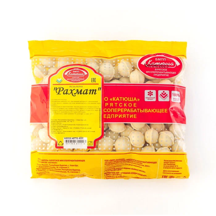 Сочные пельмени Рахмат с мясной начинкой - отличный выбор для быстрого и вкусного обеда. Упаковка весом 0,4 кг удобна для хранения и приготовления.
