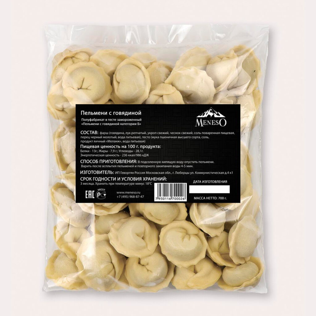 Говядина, лук репчатый, соль поваренная пищевая, перец черный молотый, вода питьевая, мука пшеничная высшего сорта, продукт яичный «Меланж», вода питьевая, соль поваренная пищевая