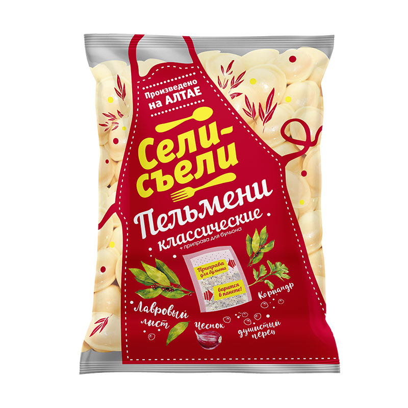 Пельмени «Сели-съели» Классические – это замороженный полуфабрикат, состоящий из теста и мясной начинки. Они быстро готовятся, не развариваются и могут быть дополнены приправой для бульона для усиления вкуса.