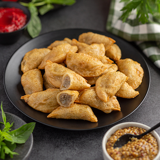 Пельмени ЭЛИКА Жару-пели обжаренные отличаются нежной сочной текстурой и насыщенным ярким вкусом. Удачным сопровождением к такому блюду станет горчичный, чесночный, сметанный, сырный или другой соус.