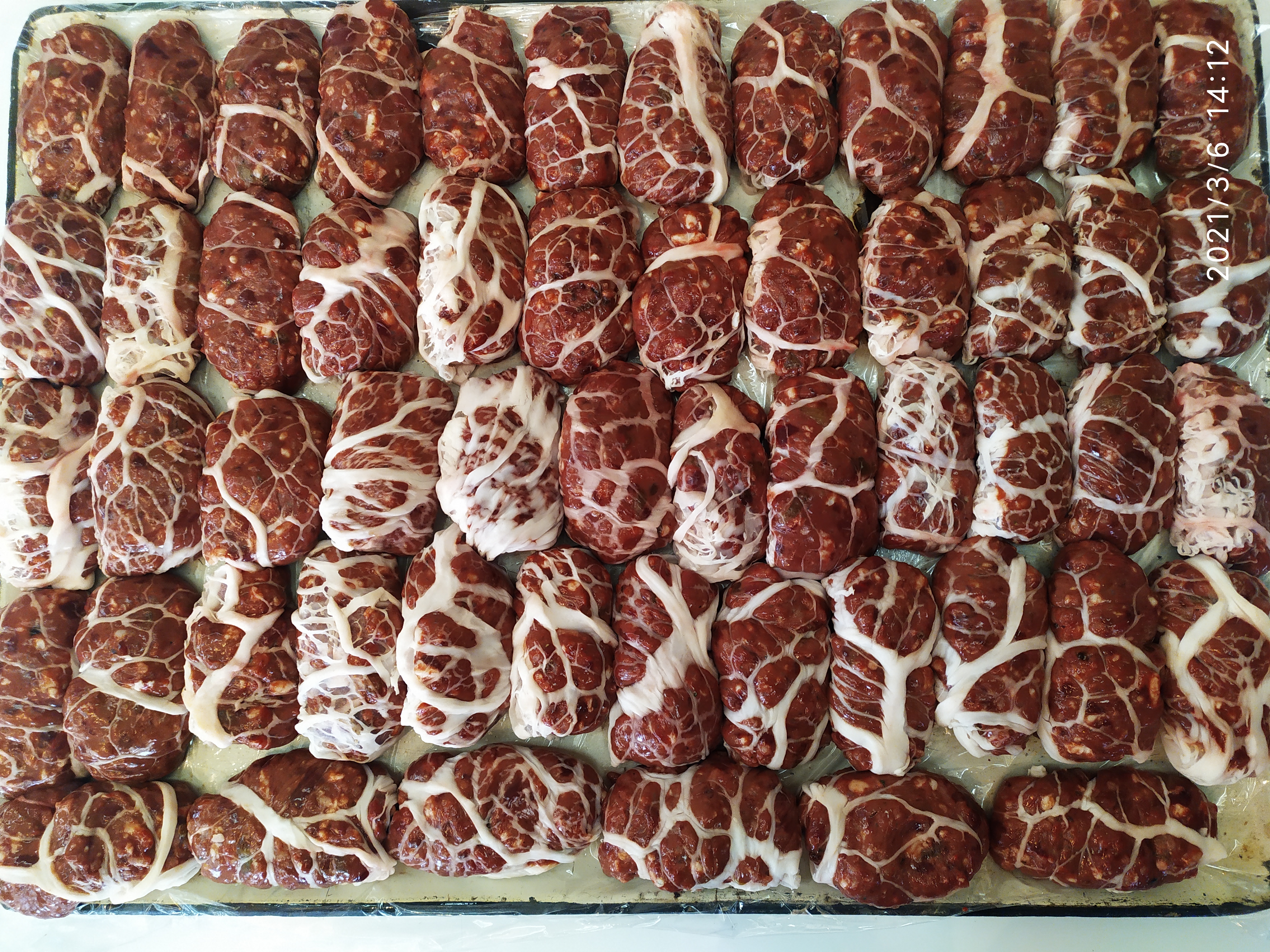 | Сальники печеночные в жировой сетке | Сетка жировая свиная, печень свиная, лук репчатый, чеснок свежий, рис, соль, перец черный молотый. | 230,0 | Гофроящик, 5кг |