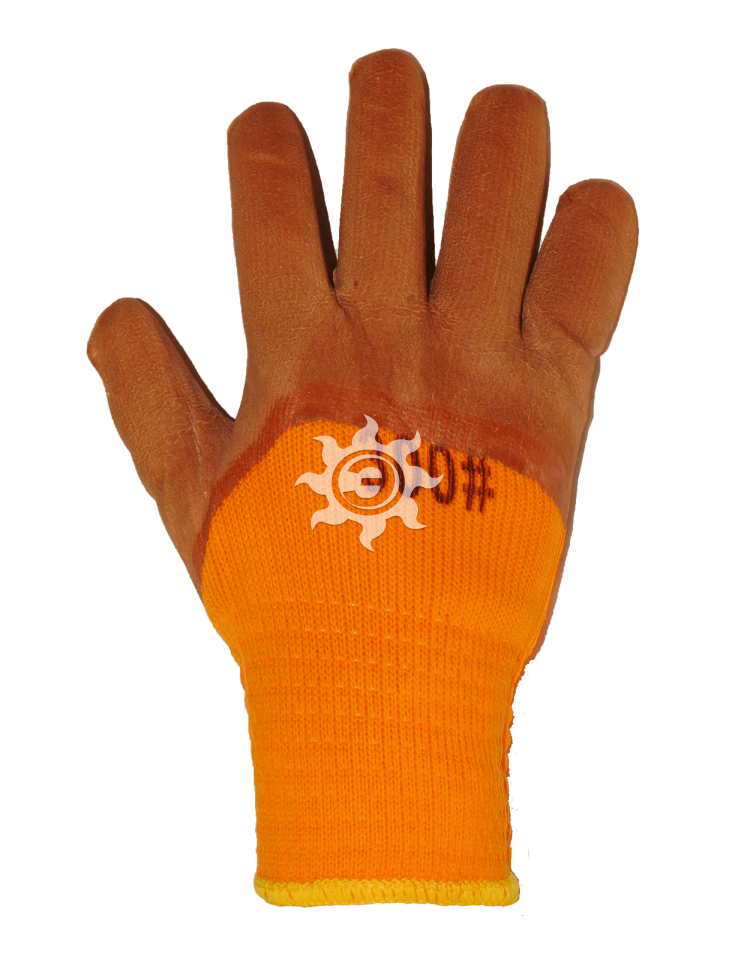Перчатки акриловые со вспененным латексным покрыт. глубокого мокания основа 10 класса вязки.Покрытие ладони - текстурированный латекс глубокого мокания коричневого цвета.Перчатки предназначены для использования до - 10 градусов Цельсия.Текстурированное латексное покрытие предотвращает проскальзывание обледенелых или холодных предметов или влажных и скользких предметов, предотвращает намокание перчатки. Плотная толстая основа со специальным начесом внутри сохраняет тепло рук и позволяет с комфортом работать на улице в зимний период при любой температуре до -10.Длинный манжет перчатки обеспечивает хорошую защиту от попадания снега на руку, конструкционная особенность манжета состоит в том, что при своей хорошей плотности он хорошо тянется и может быть одет сверху на рукав одежды для предупреждения попадания снега и холода под рукав или перчатку. Плотный двойной цветной оверлок с латексным кольцом предотвращает скатывание манжета - перчатка всегда остается плотно зафиксированной на руке.