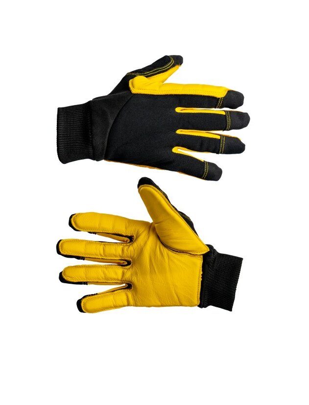Тыльная сторона перчаток изготовлена из микрофибры (55% ПУ + 45% нейлон) и эластичного полиэстера, что обеспечивает свободу движений. Усиленные кончики пальцев и зона фаланг большого пальца повышают легкость манипуляций, а межпальцевое пространство из полиэстера контрастного цвета увеличивает износостойкость. Манжета из трикотажа (ПЭ + спандекс) плотно фиксирует перчатки, не сдавливая запястье.