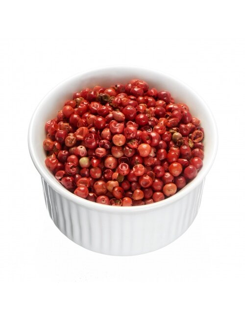 Ароматные горошины розового перца - плоды перуанского перца или бразильского перца. В кулинарии, повара ценят розовый перец не только за его мягкий перечный вкус с мятно-имбирным послевкусием, но и за нежный, свежий, древесно-фруктовый запах.
