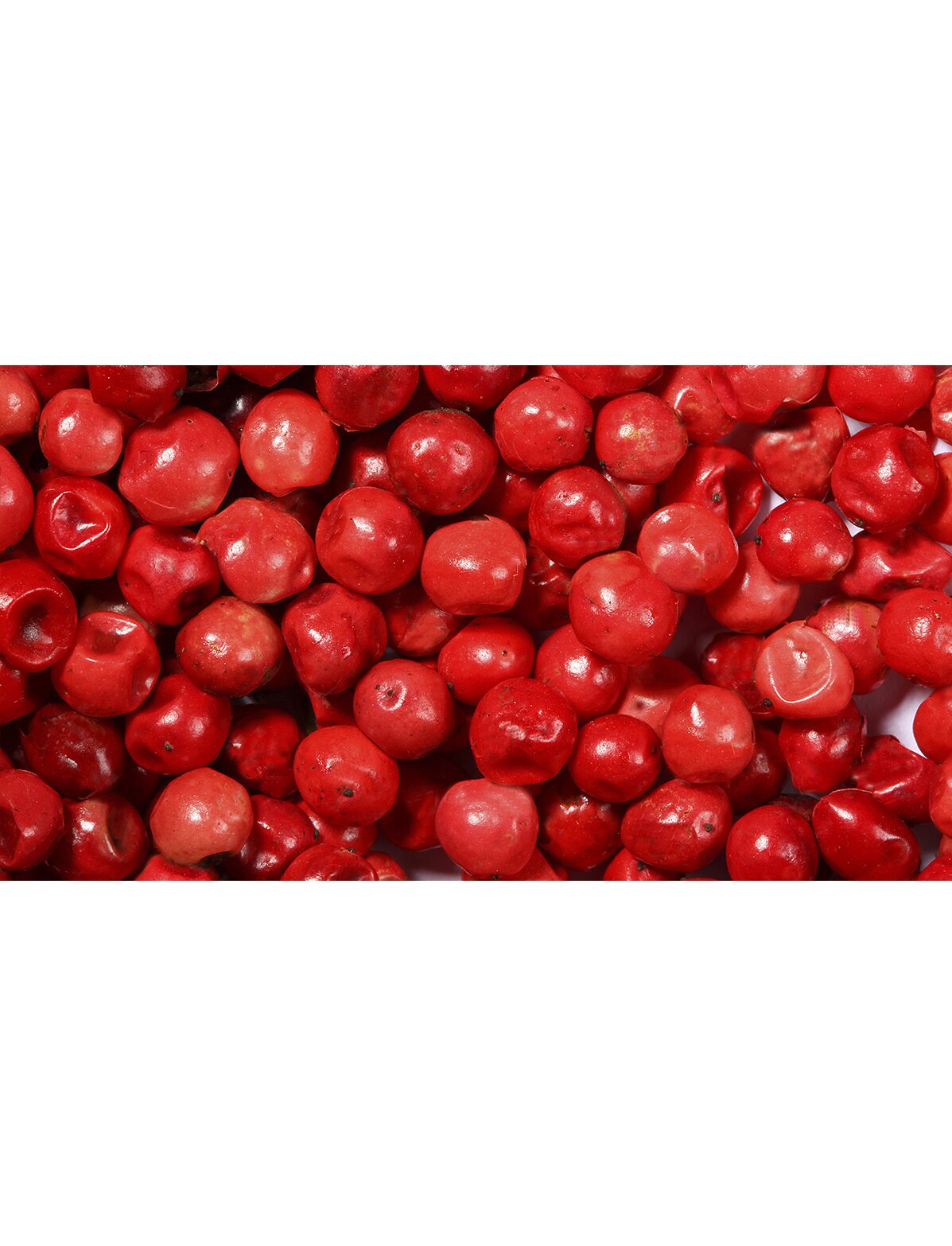 Горошины в диаметре достигают 5-6 мм, отличается темно-розовым или красным цветом и морщинистой поверхностью. Их вкус практически не острый, немного сладковатый с ароматом ментола, изюма, смолы, можжевельника, аниса и хвои.