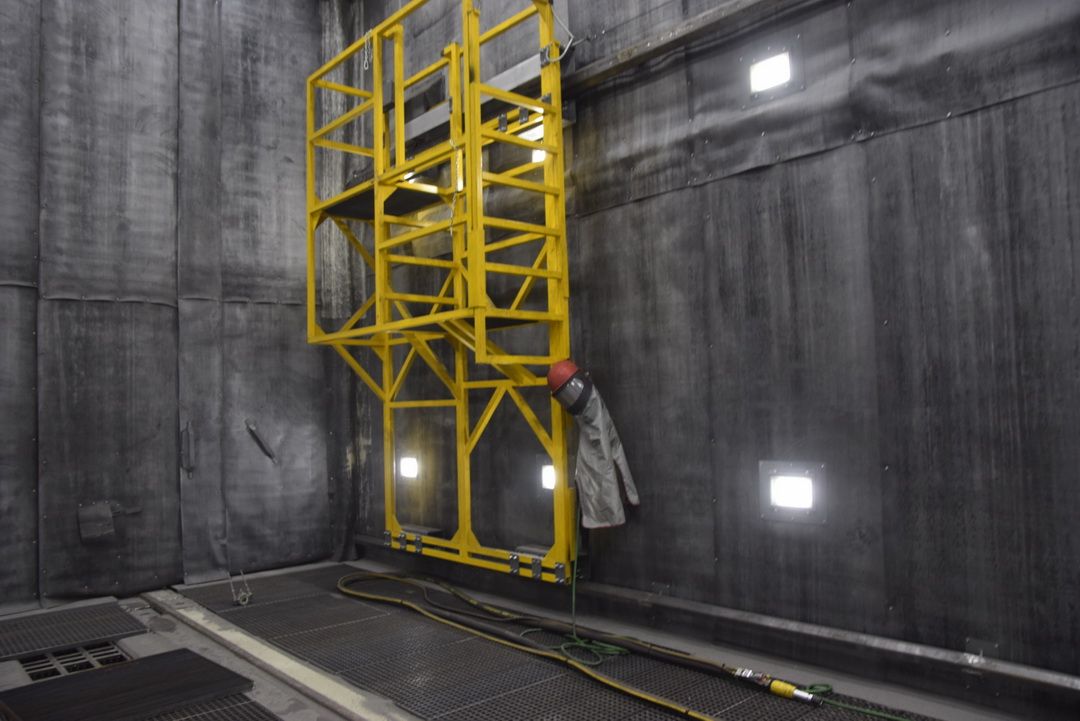 Передвижные площадки оператора предназначены для работы с крупногабаритными изделиями, располагаются на стенах камеры. Перемещение площадок оператора осуществляется вдоль стен с помощью приводной станции, которая расположена вне камеры. Приводная станция включает в себя мотор-редуктор с приводным колесом, тросом и обводным роликом. Плавный пуск с частотным преобразователем расположен в главном распределительном шкафу и интегрирован в общую схему установки. В комплект оборудования входит дистанционный пульт управления площадкой оператора. Лестница может подниматься вверх или откидывается в бок, создавая возможность оператору проходить под площадкой.