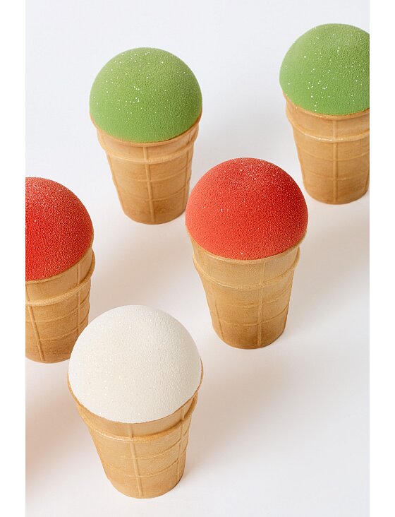 Один из любимых десертов команды нашей кондитерской - пирожные в вафельном стакане, реалистично напоминающие советское мороженое. В данном варианте -покрытые мерцающим кондитерским велюром в праздничных цветах нового года.