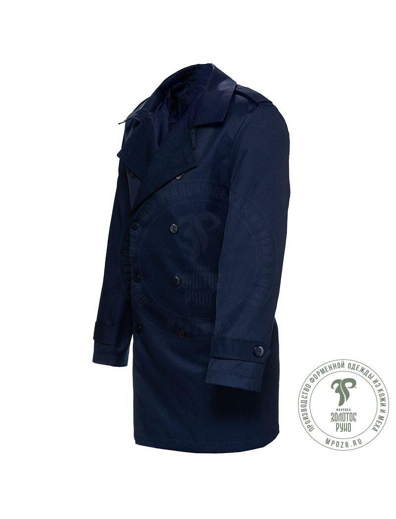 Плащ мужской темно-синего цвета - это элемент демисезонной формы одежды прокурорских работников РФ (имеющих классные чины), предназначенный для ношения в межсезонье. Он является частью официального обмундирования, оснащается погонами и ведомственными эмблемами, защищая от осадков и ветра при исполнении служебных обязанностей. Плащ мужской полуприлегающего силуэта, со смещенной бортовой застежкой на пять обметанных петель и пять пуговиц, с втачными рукавами, с отложным воротником и лацканами. Так же имеются погоны-муфты ширина 4,5 см. Плащи мужские изготавливаются по размерам на типовые фигуры мужчин.