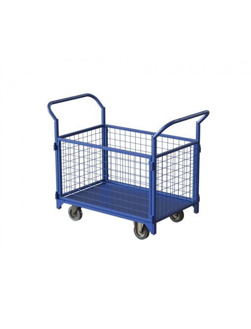 Тележка платформенная с сетчатыми бортами, высотой 500 мм. Предназначена для транспортировки грузов по складским помещениям. Основание тележки усилено ребрами для большей жесткости. Фланцы колесных опор имеют универсальное крепление для колес разного диаметра 100-160 мм. Борта тележки съемные.
