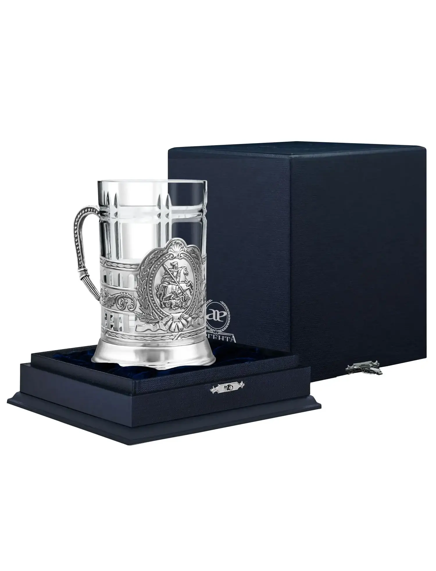 Подстаканник "Георгий Победоносец" - это элитный художественный предмет сервировки стола, украшенный чеканным изображением герба с Георгием Победоносцем. Используется для эстетичного чаепития, как статусный подарок или сувенир, символизирующий защиту, победу и патриотизм. Подстаканник "Георгий Победоносец" гербовый среднего веса - 129 гр. Длина- 72 мм. Ширина- 72 мм. Высота - 95 мм. Диаметр - 72 мм. Стакан "Чайный" клетка - 260 гр. Длина - 65 мм. Ширина - 65 мм. Высота - 100 мм. Диаметр - 65 мм. Объём - 200 мл. Размер футляра - 132*132*165 мм. Вес набора в футляре - 791 гр.