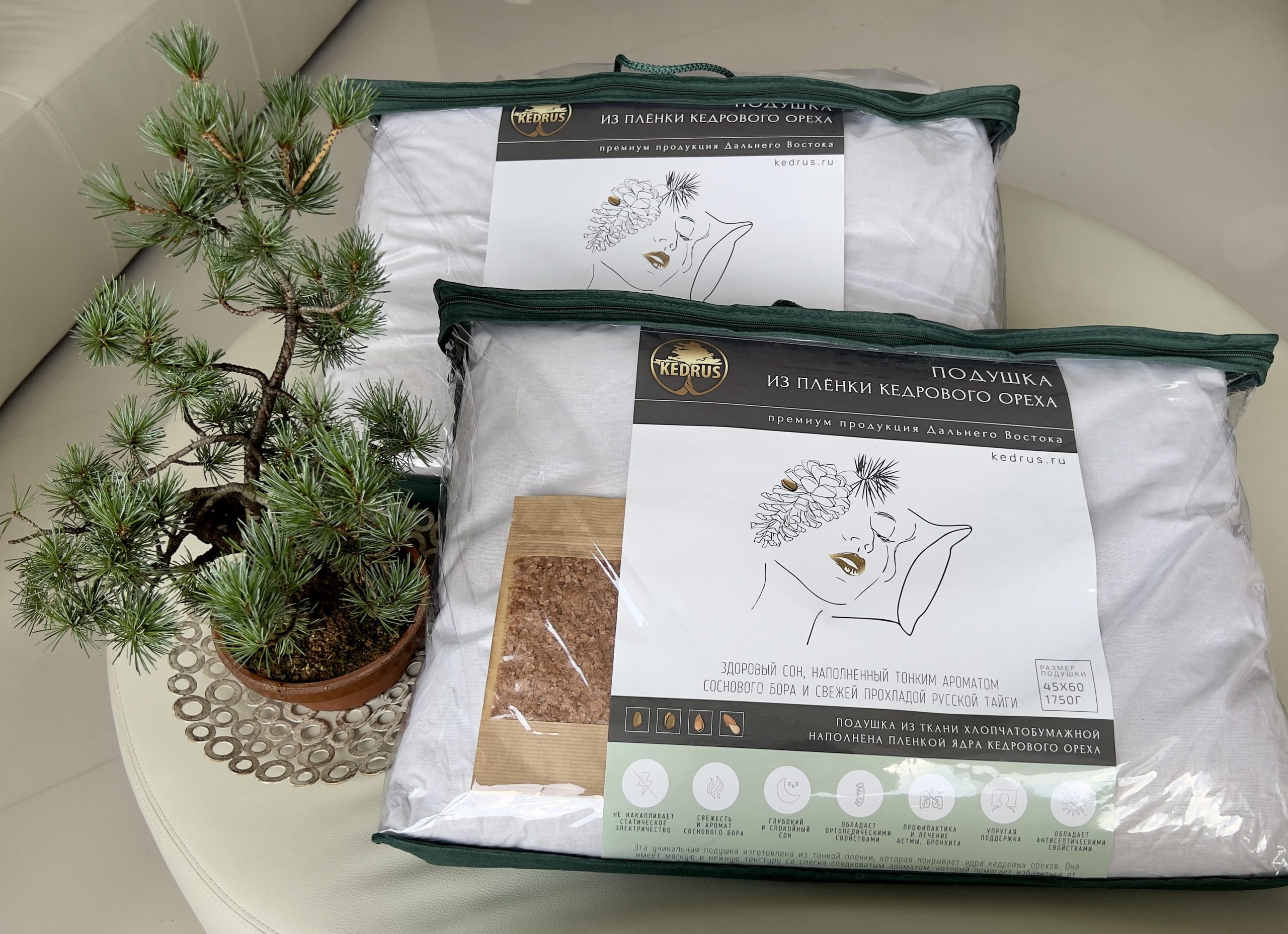 Абсолютно уникальная подушка изготовлена из тонкой пленки, которая покрывает ядра кедровых орехов. Она имеет мягкую и нежную текстуру со слегка сладковатым ароматом, который помогает избавиться отстресса и бессонницы.