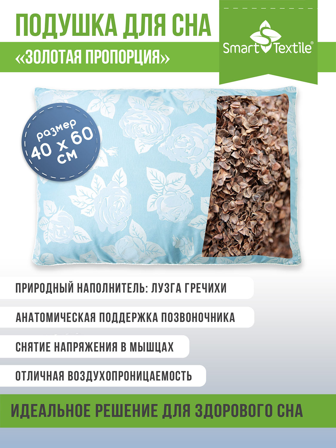 Подушка "Золотая пропорция" с лузгой гречихи 60х40 см чехол тик смесовой анатомическая с натуральным природным наполнителем – лепестками лузги гречихи, рекомендована людям, страдающим от храпа, имеющим проблемы со сном, склонным к головным болям и мигрени.Благодаря сыпучести, наполнитель подстраивается под естественные контуры головы и шеи, создавая вокруг них комфортный, подвижный каркас. Таким образом, позвоночник во время сна и отдыха находится в правильном положении, мышцы шеи расслабляются, выравнивается дыхание, улучшается кровообращение. Лепестки лузги гречихи оказывают деликатное воздействие на поверхность кожи. Наполнитель гипоаллергенен, используется лузга гречихи высокой степени очистки. Подушка обладает тонким, успокаивающим, приятным природным ароматом.