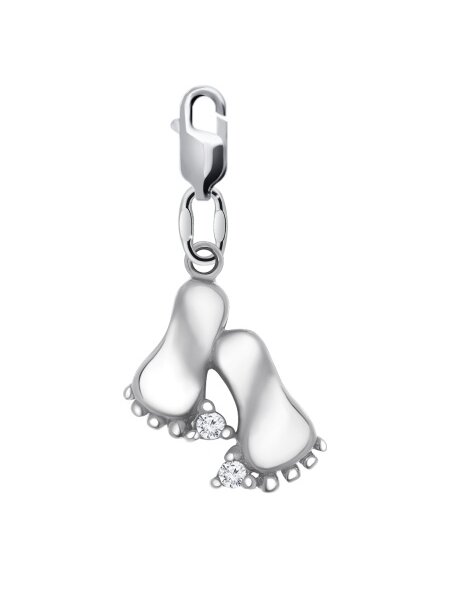 Подвеска из серебра с фианитами - это символическое ювелирное украшение, чаще всего обозначающее рождение ребенка, материнство или близкую связь между матерью и младенцем. Обычно носится на шее как кулон или на браслете, служа памятным подарком или оберегом, символизирующим начало жизненного пути. Кулон выполнен из серебра 925 пробы с родиевым покрытием для блеска, изображающий пару маленьких детских ножек (стоп). Вставки из фианитов придают украшению блеск, имитируя бриллианты. Вес - 1.4 гр. Вставка - фианит 2штуки, весом - 0,020 карат.
