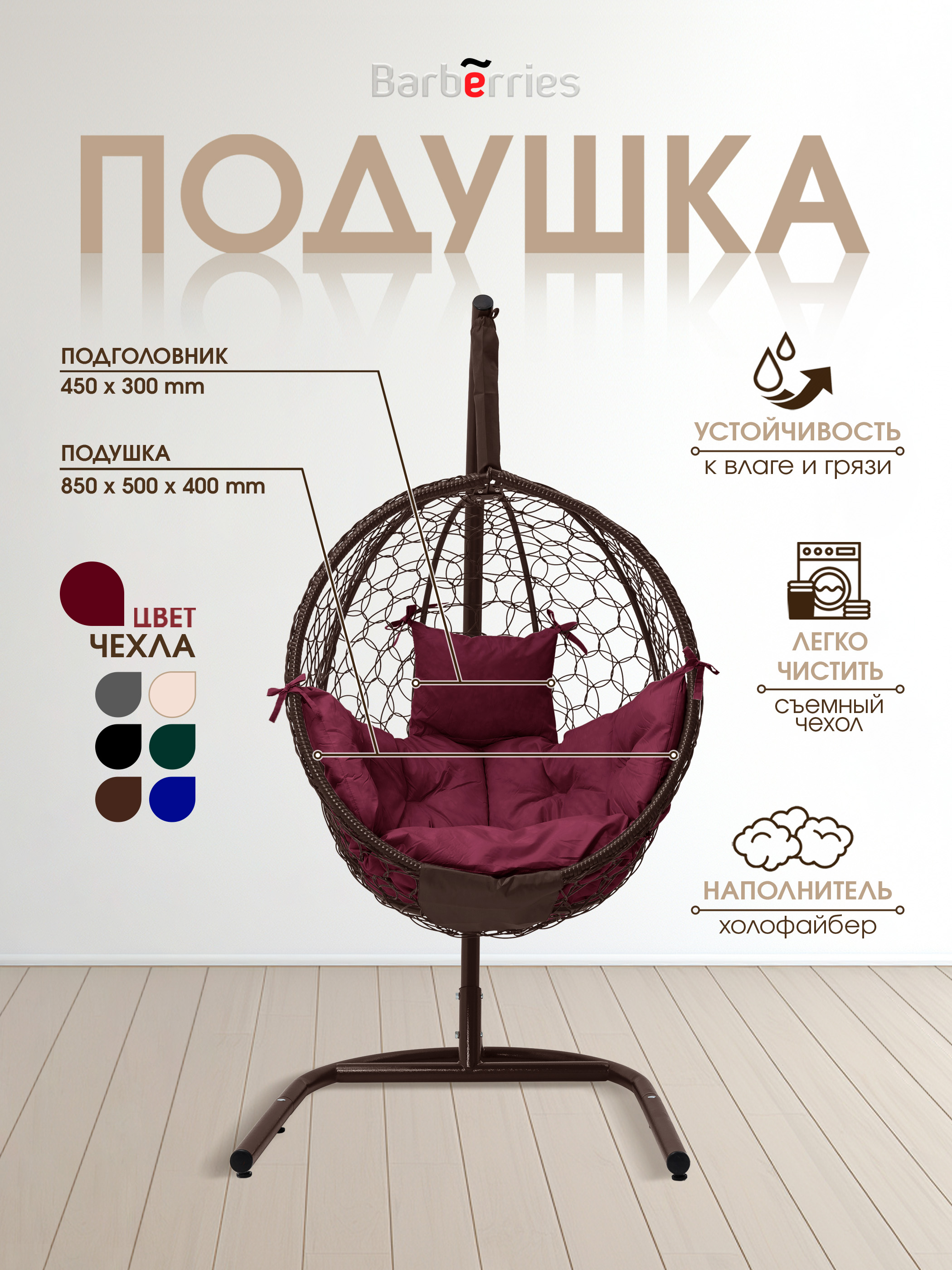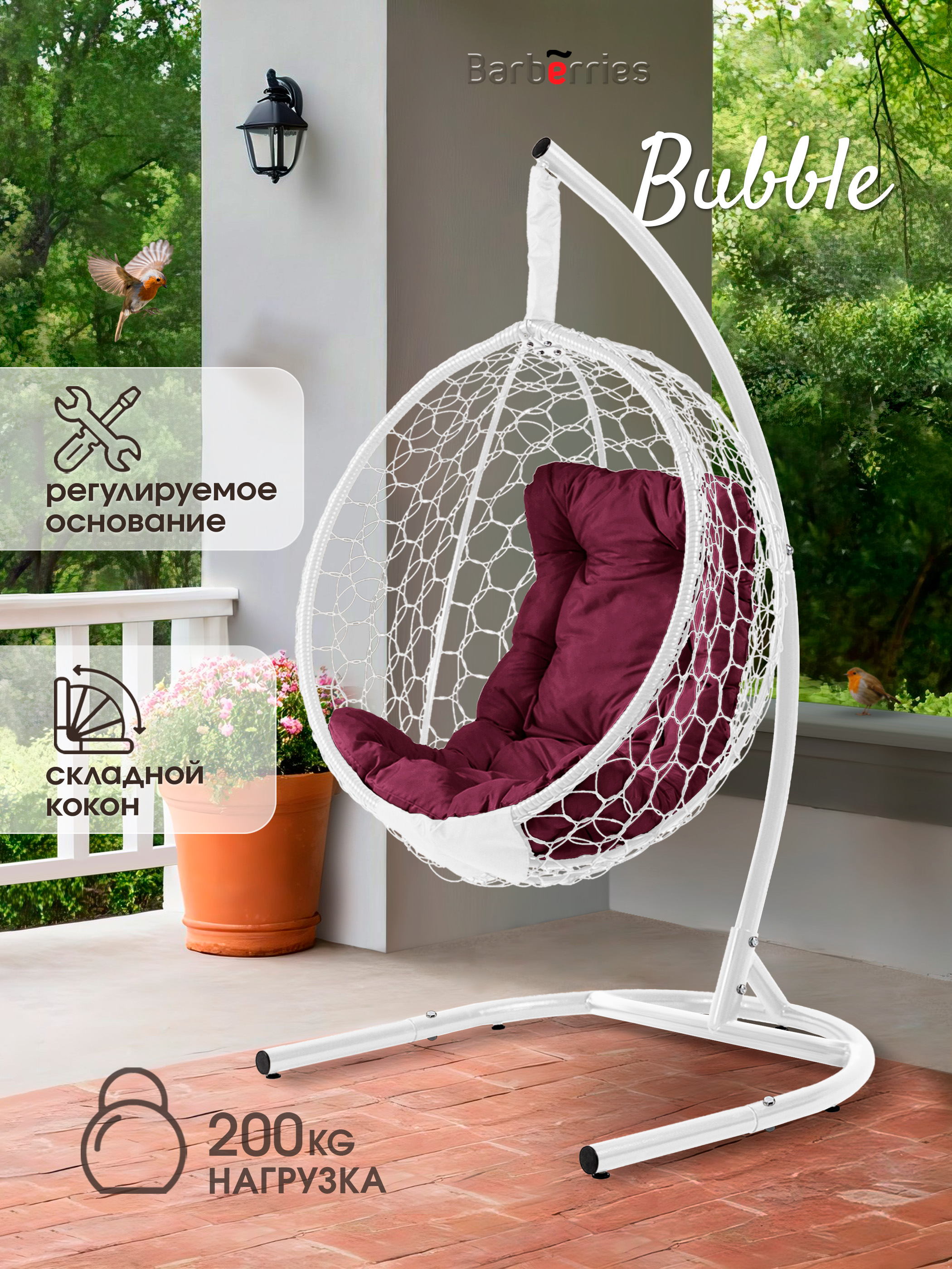 Подвесное кресло Barberries Bubble — это сочетание уюта, функциональности и дизайнерского минимализма. Благодаря складной конструкции кокона и полностью разборной стойке, кресло легко установить даже в помещениях с узким проходом — например, на балконе или лоджии.
