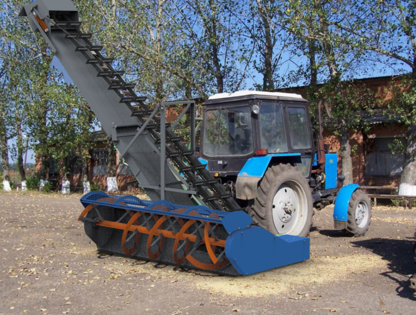 Питатель шнекового типа, который в отличие от скребкового позволяет эффективнее подбирать слежавшееся зерно. Соединение с трактором производится посредством БСУ (быстро соединяющегося устройства).