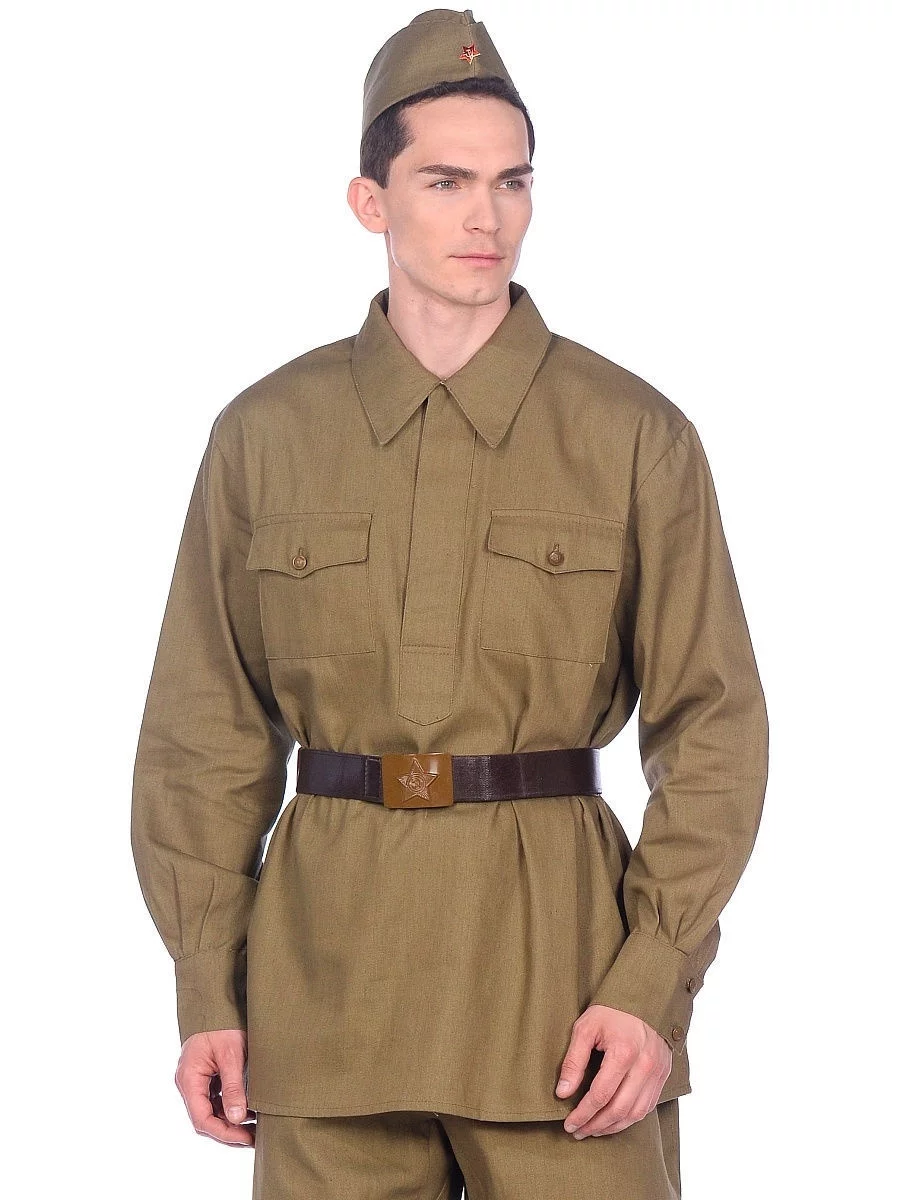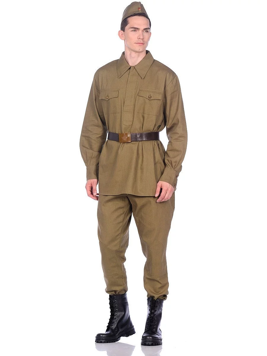 Летняя полевая гимнастерка РККА образца 1935 года с галифе и пилоткой в комплекте. Гимнастерка изготовлена из хлопчатобумажной ткани защитного цвета с отложным воротником, застегивающимся на один крючок. Имеет нагрудную планку с застежкой на три пуговицы защитного цвета и два нагрудных кармана с клапанами на одной пуговице защитного цвета. Рукава имеют обшлага с двумя пуговицами также защитного цвета. Галифе классического кроя. Пилотка с установленной звездой защитного цвета. Комплект можно дополнить одношпеньковым кожаным ремнём, петлицами и петличными эмблемами. Гимнастерки и пилотки можно купить отдельно.